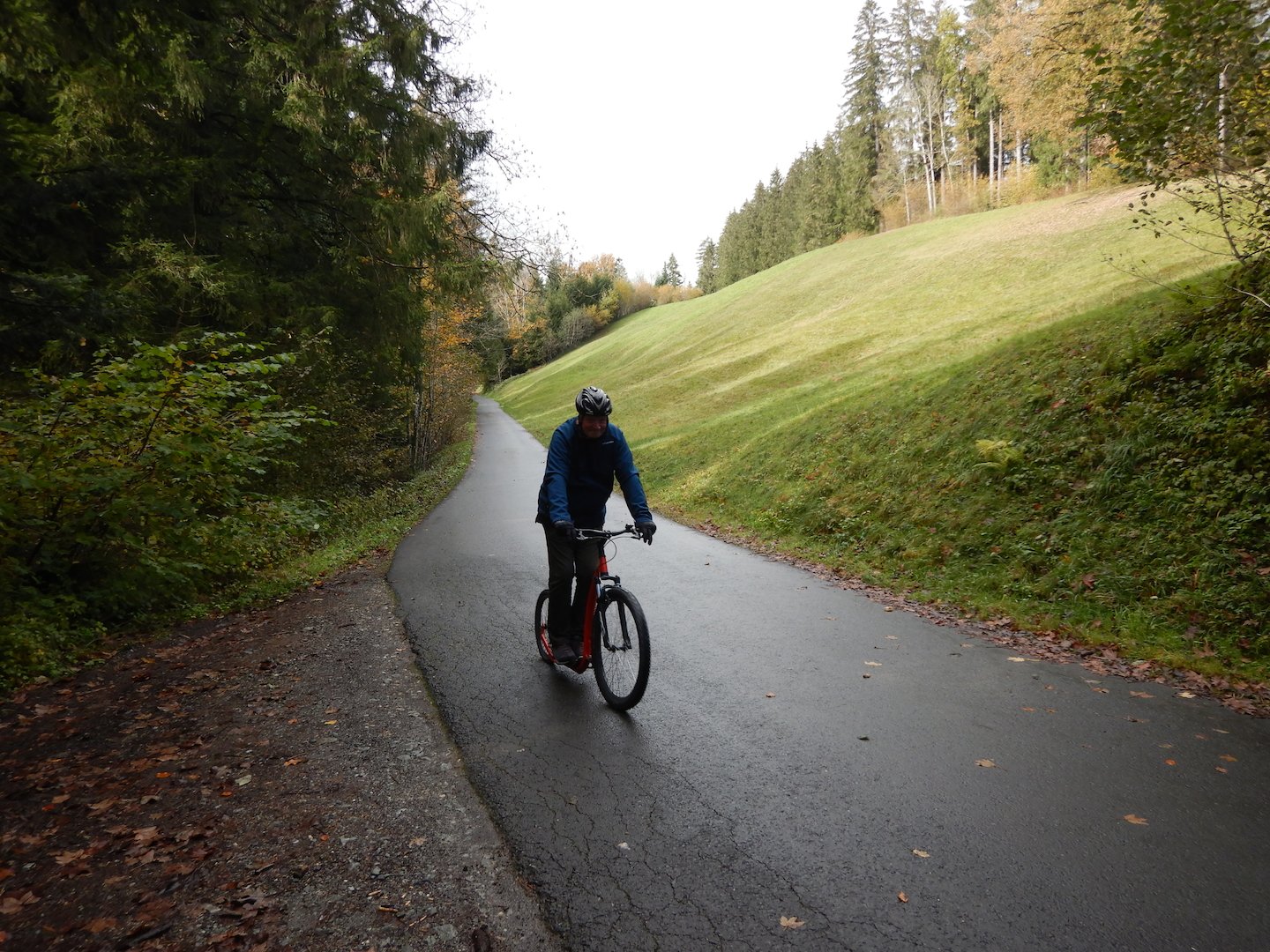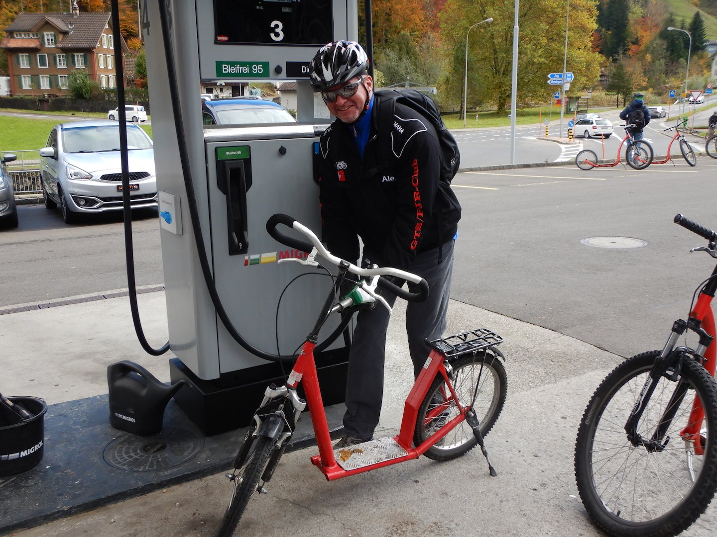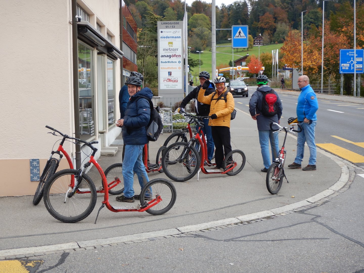 Das Trottifahren begann unerwartet mit einem kleinen Fussmarsch, welcher manchen etwas ins Schwitzen brachte. Dafür wurde die Abfahrt umso mehr genossen. Aber oweh, da es bis am Vormittag noch geregnet hatte, waren die Strassen und Wege in den Waldpartien noch nass und so hatten die meisten von uns nach kurzer Zeit einen braunen Streifen auf der Hose.