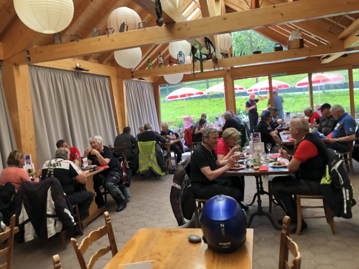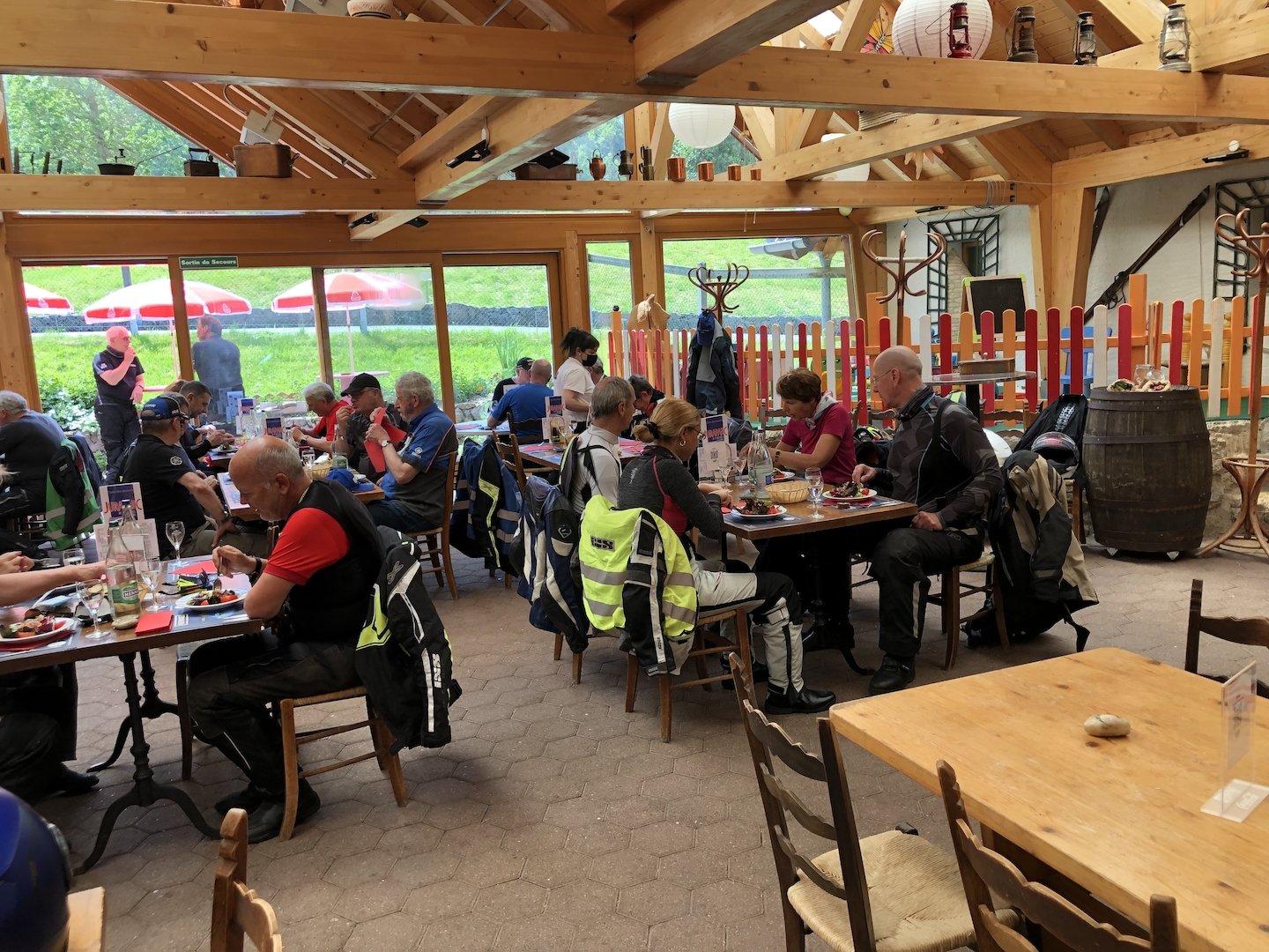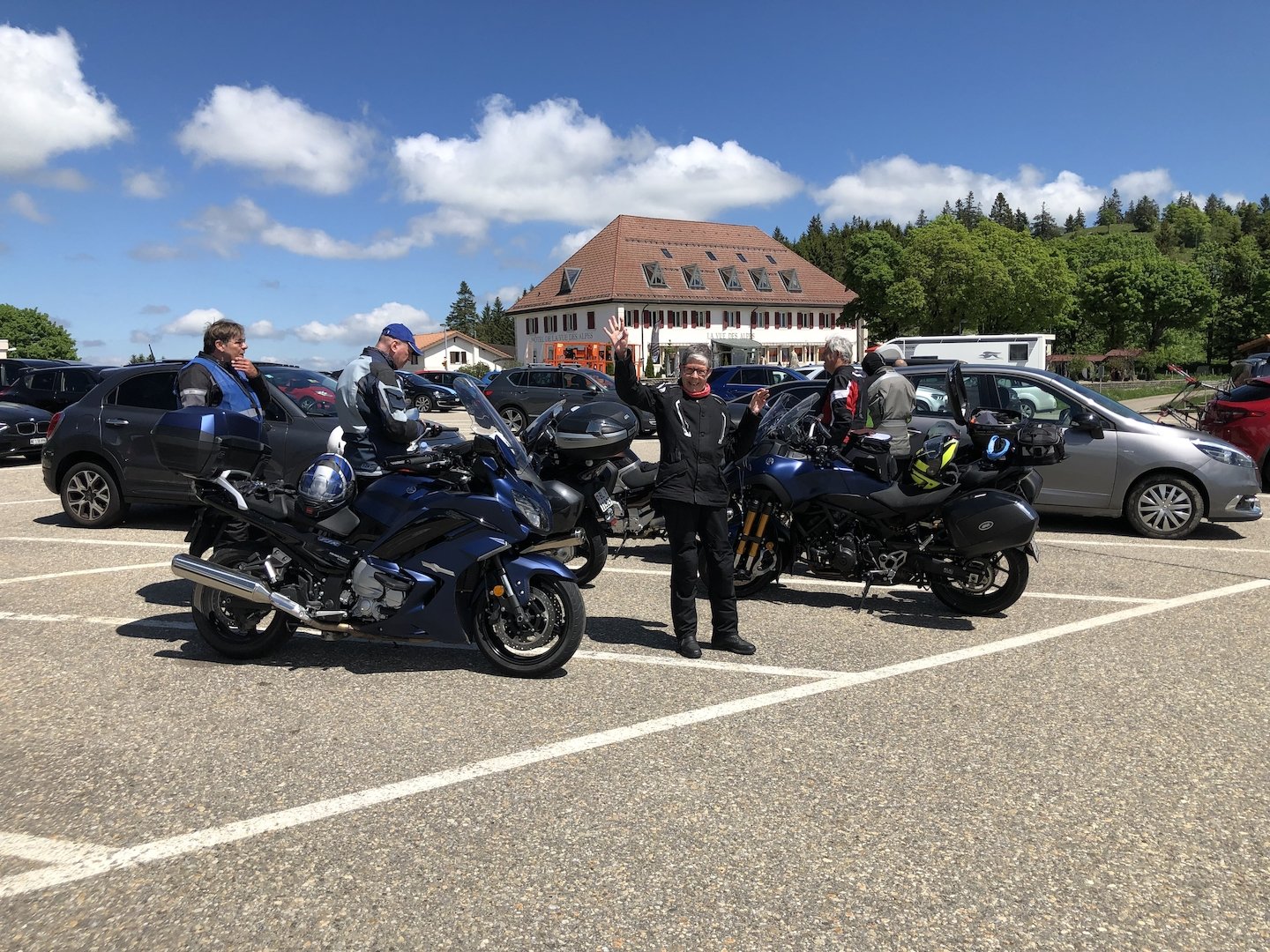 Am Sonntagmorgen belagerten die Frühaufsteher bereits vor sieben Uhr das Frühstücksbuffet. Ungeduldig sassen alle Teilnehmer schon 10 Minuten vor dem Termin auf ihren Maschinen. Wieder lockte eine gehörige Portion Kurven. Als Warm-up war diszipliniert der Grenchenberg zu überqueren. Dann konnte der Walzer beginnen: Perrefitte - Les Ecorcheresses (die Strecke eines mythischen Bergrennens) - weiter via Pichoux-Schlucht und Col des Rangiers zur Gilberte de Courgenay und zurück über den Col de la Croix. Linkskurven, Rechtskurven, rauf und runter, Ste-Ursanne - Epauvillers – Soubey - Les Enfers. Nach dieser Achterbahnfahrt beruhigte sich der Puls in sanftem Auslauf nach Westen, bevor zum Dessert nochmals die Vue des Alpes von Norden her bezwungen wurde. Der Jura hat wirklich viele schöne Töffstrassen zu bieten. Ziel der Sonntagsfahrt war das Restaurant Du Port in Erlach, wo Oncel und sein Team das abschliessende Mittagessen für uns vorbereitet hatten.