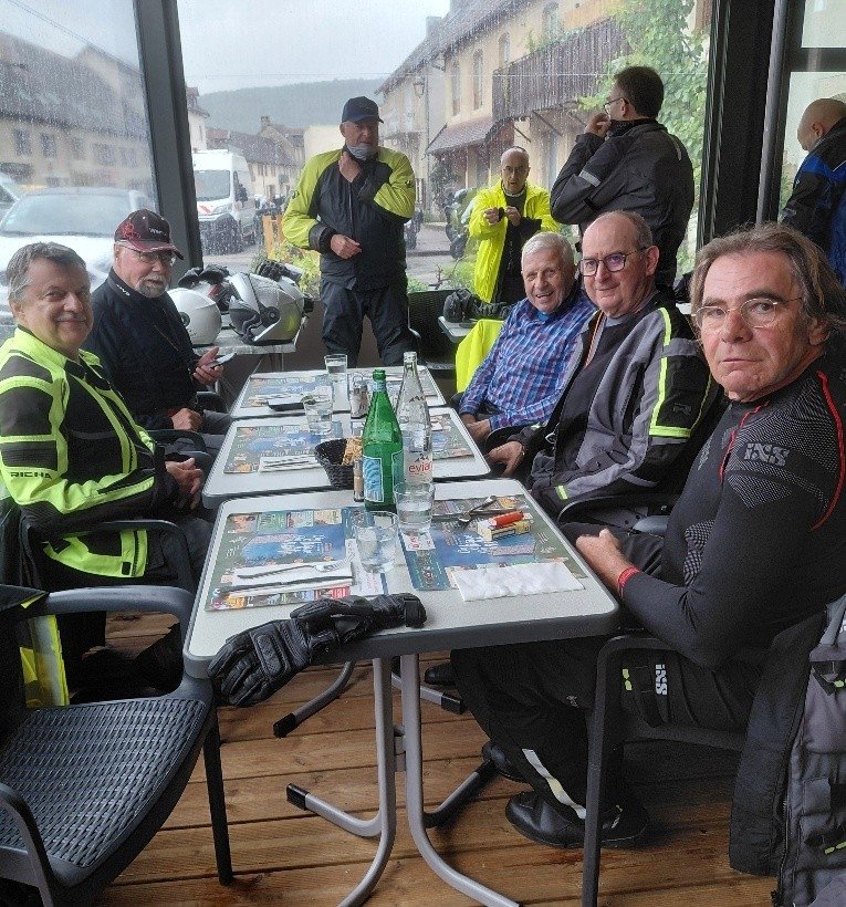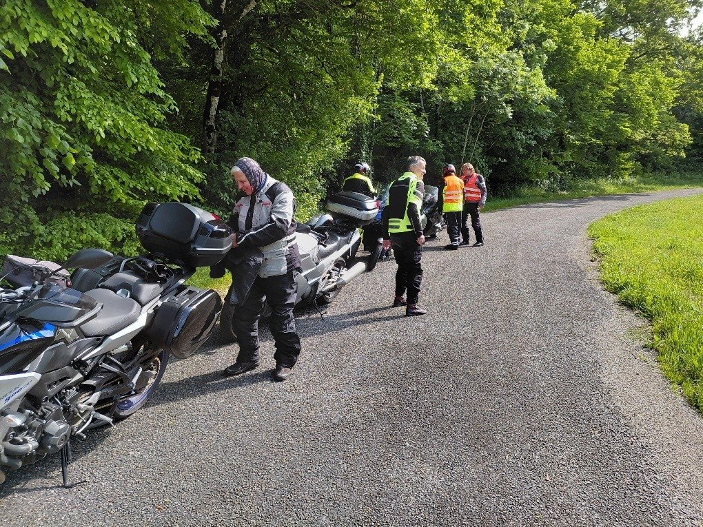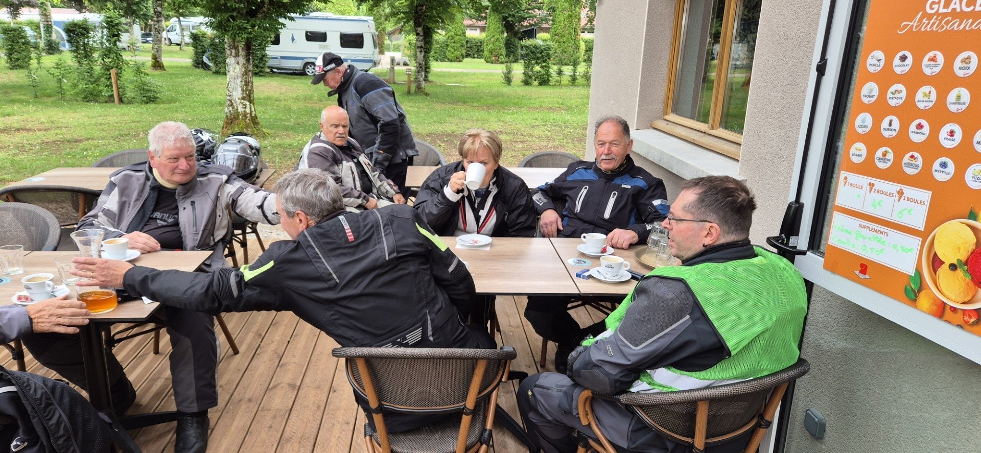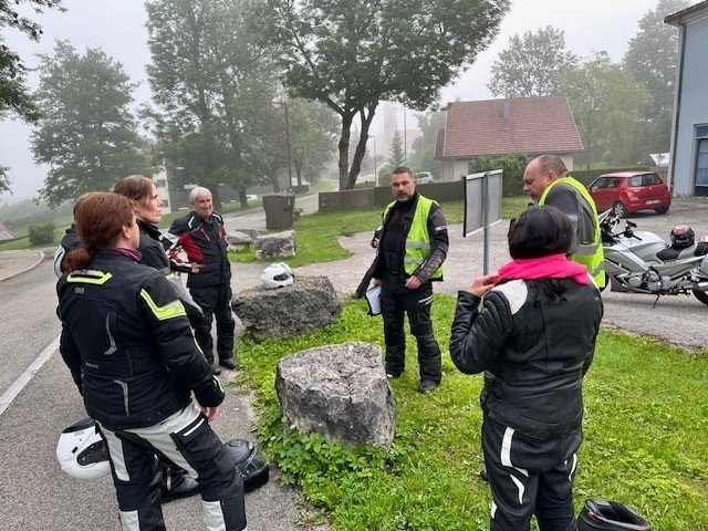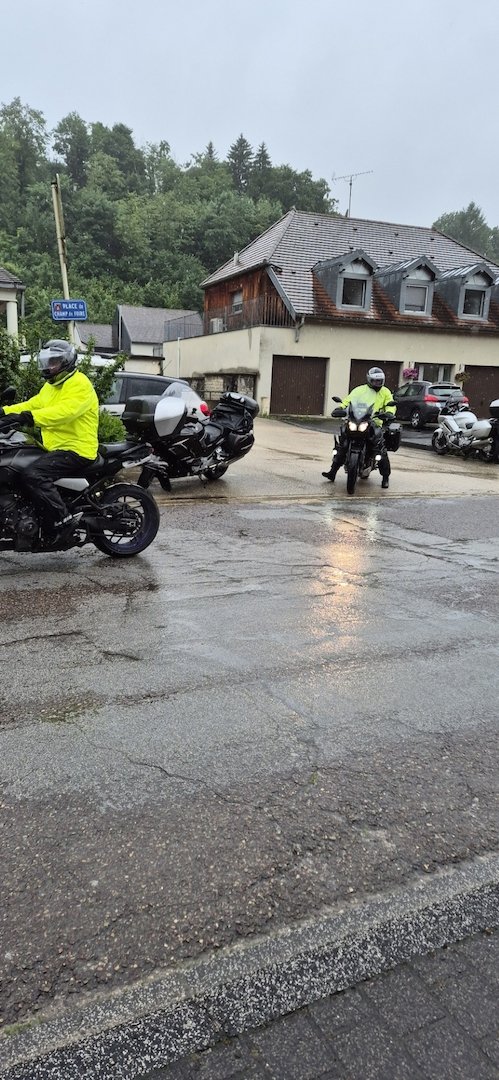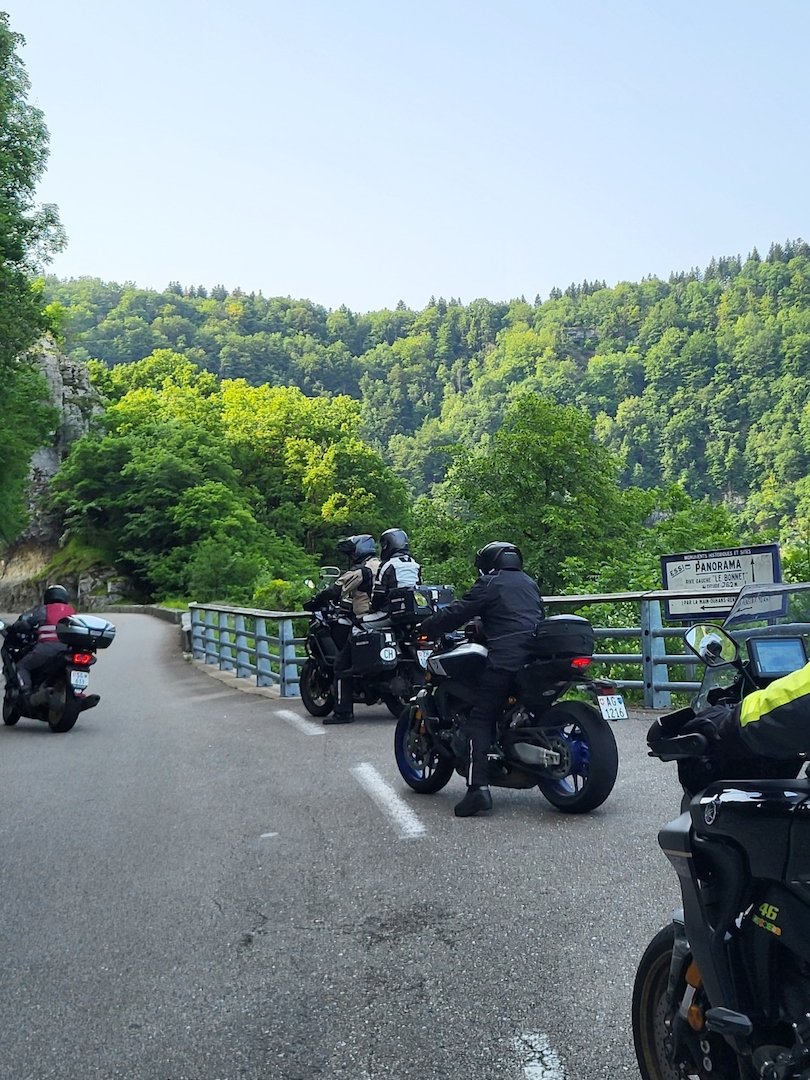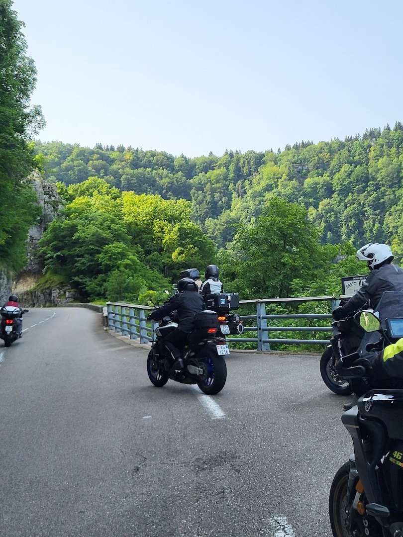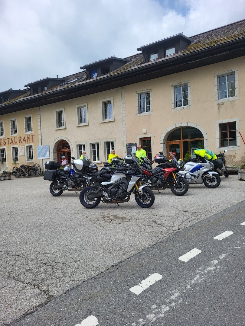 Heureusement, le dimanche a apporté une nette amélioration. On a certes démarré prudemment en combinaison de pluie, mais dès la pause-café à la Pont-de-la-Pyle, les rayons du soleil ont percé les nuages. Combinaisons rangées, lunettes de soleil sorties : voilà enfin l’esprit de la Sortie romande. Par des routes sèches et sinueuses, nous avons rejoint Saint-Claude pour le repas de midi, puis repris la route vers Maubuisson en passant par la Suisse et le col du Marchairuz – une belle parenthèse nostalgique qui nous a rappelé les anciennes sorties LBD vers Nantua, il y a plus de 15 ans.