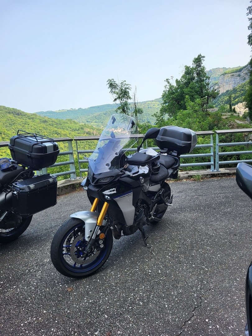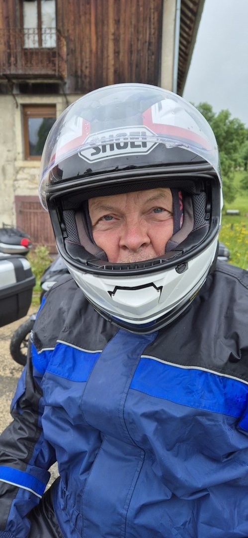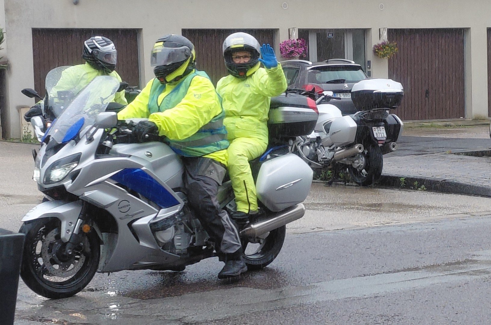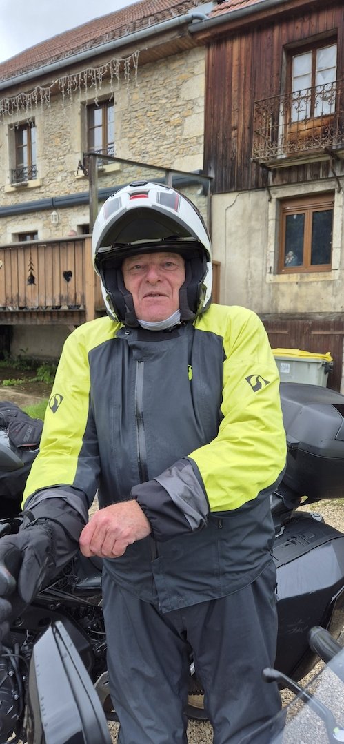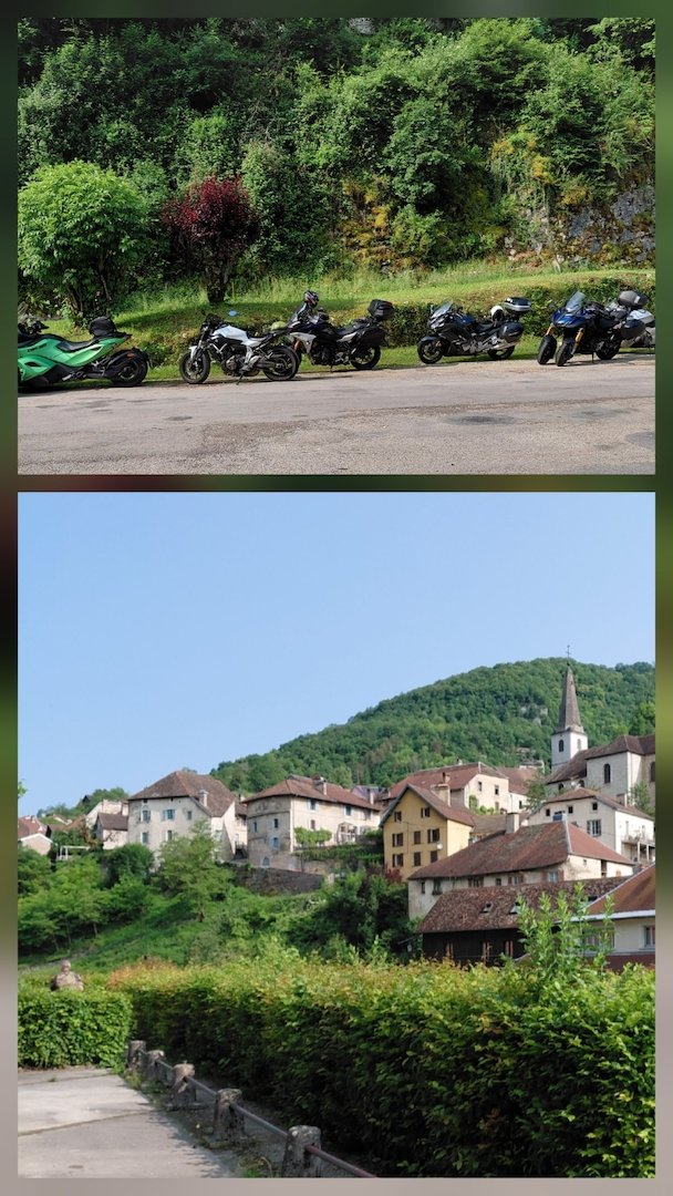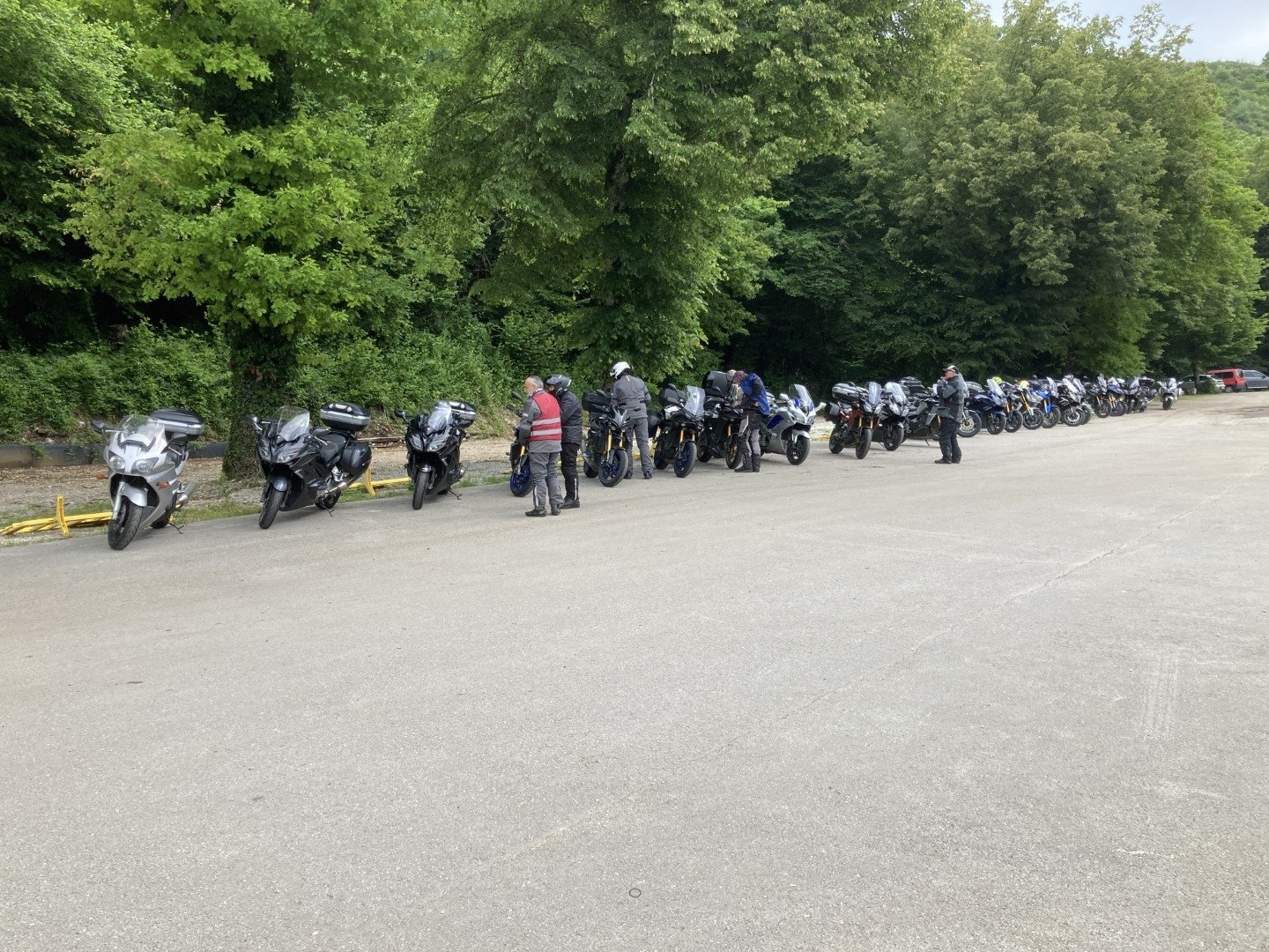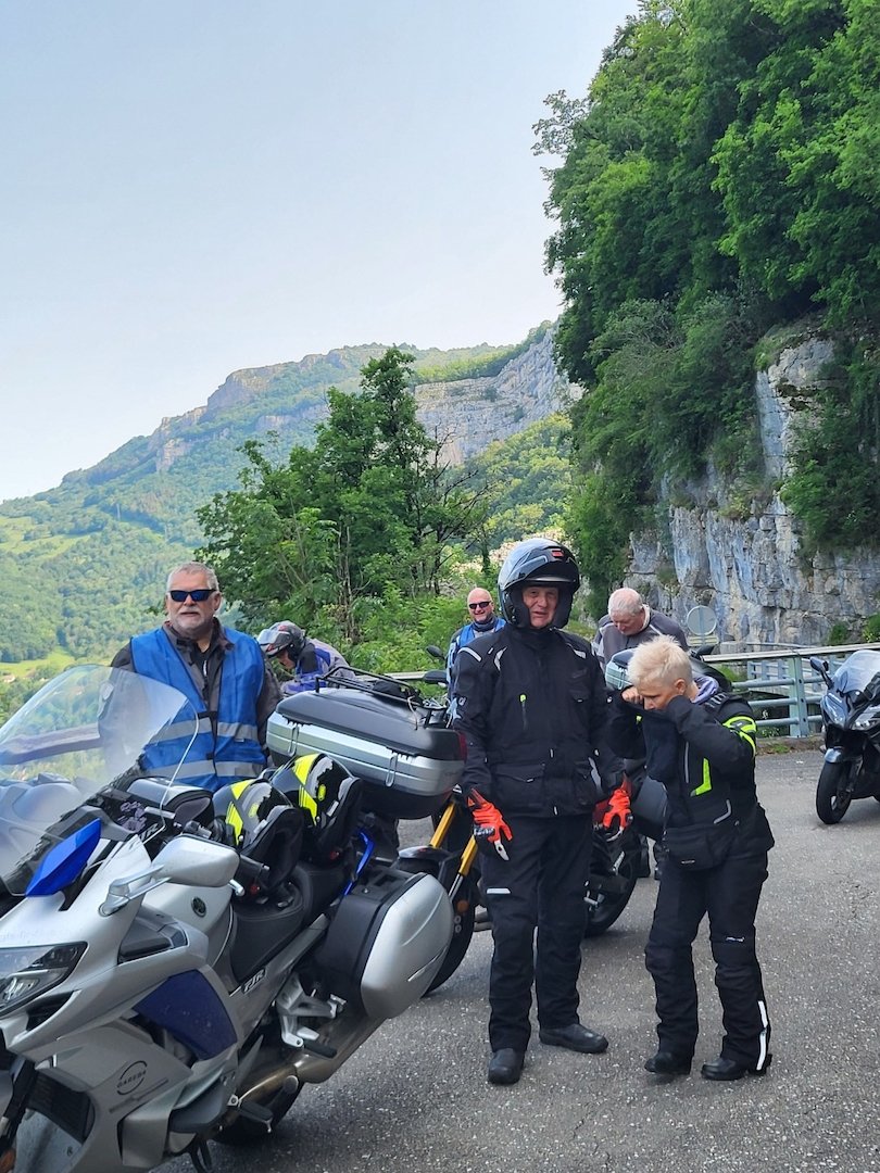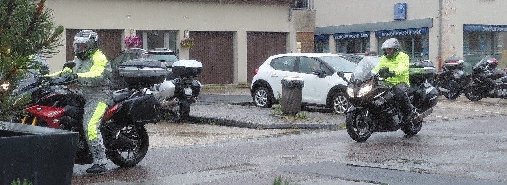 Heureusement, le dimanche a apporté une nette amélioration. On a certes démarré prudemment en combinaison de pluie, mais dès la pause-café à la Pont-de-la-Pyle, les rayons du soleil ont percé les nuages. Combinaisons rangées, lunettes de soleil sorties : voilà enfin l’esprit de la Sortie romande. Par des routes sèches et sinueuses, nous avons rejoint Saint-Claude pour le repas de midi, puis repris la route vers Maubuisson en passant par la Suisse et le col du Marchairuz – une belle parenthèse nostalgique qui nous a rappelé les anciennes sorties LBD vers Nantua, il y a plus de 15 ans.