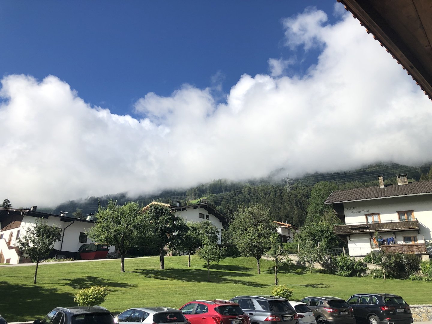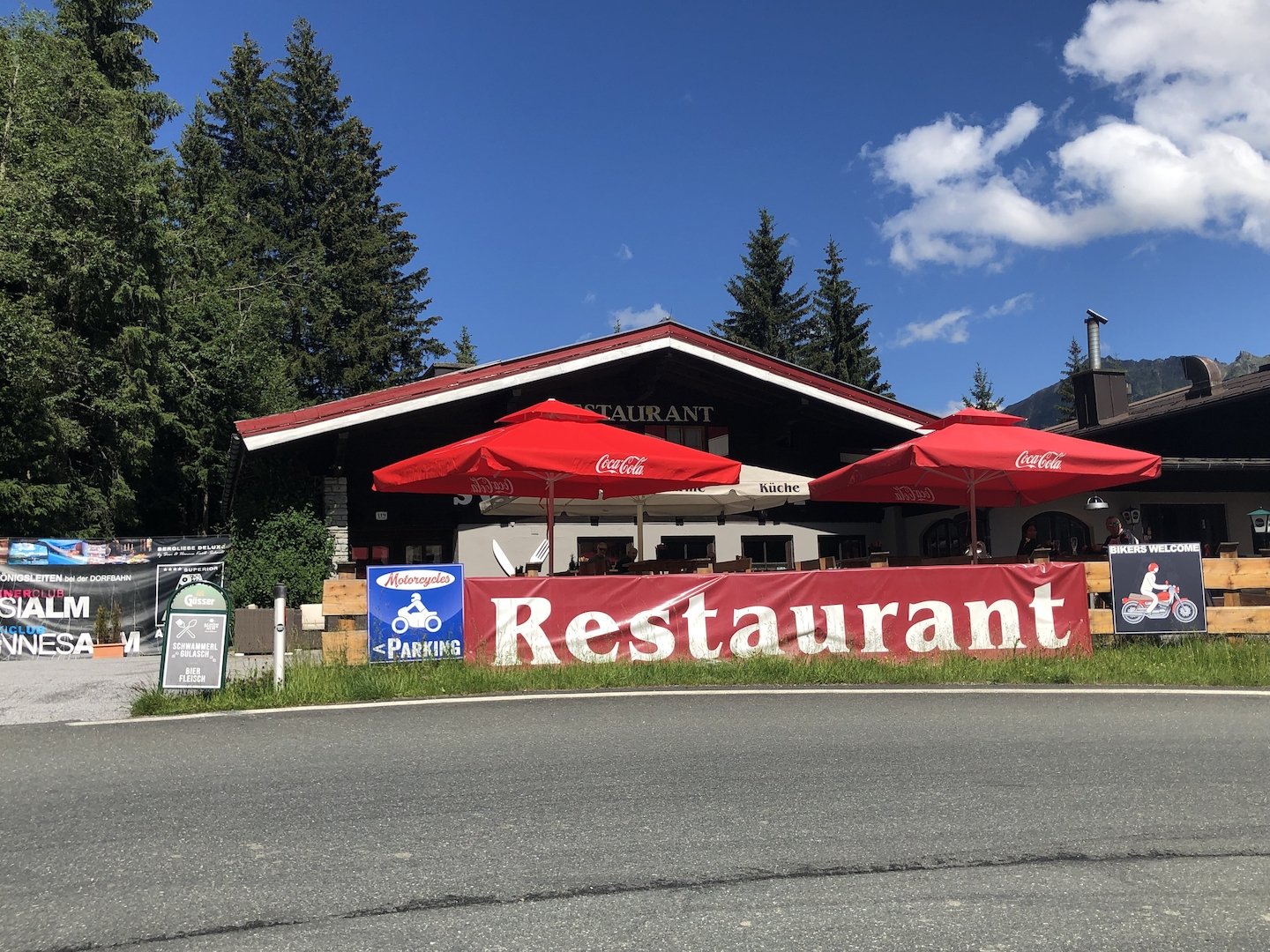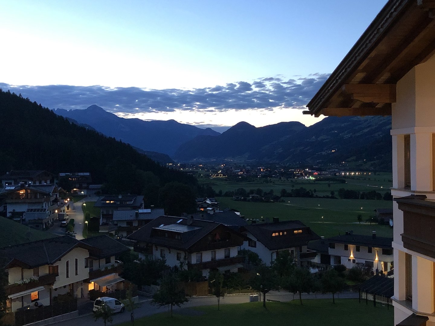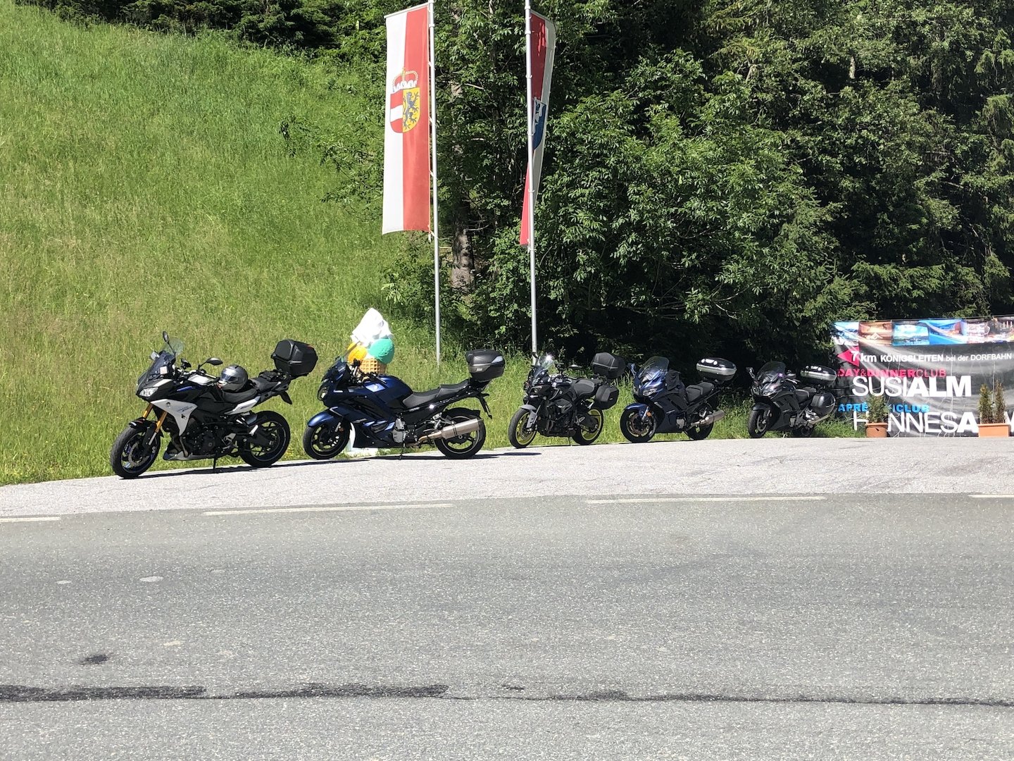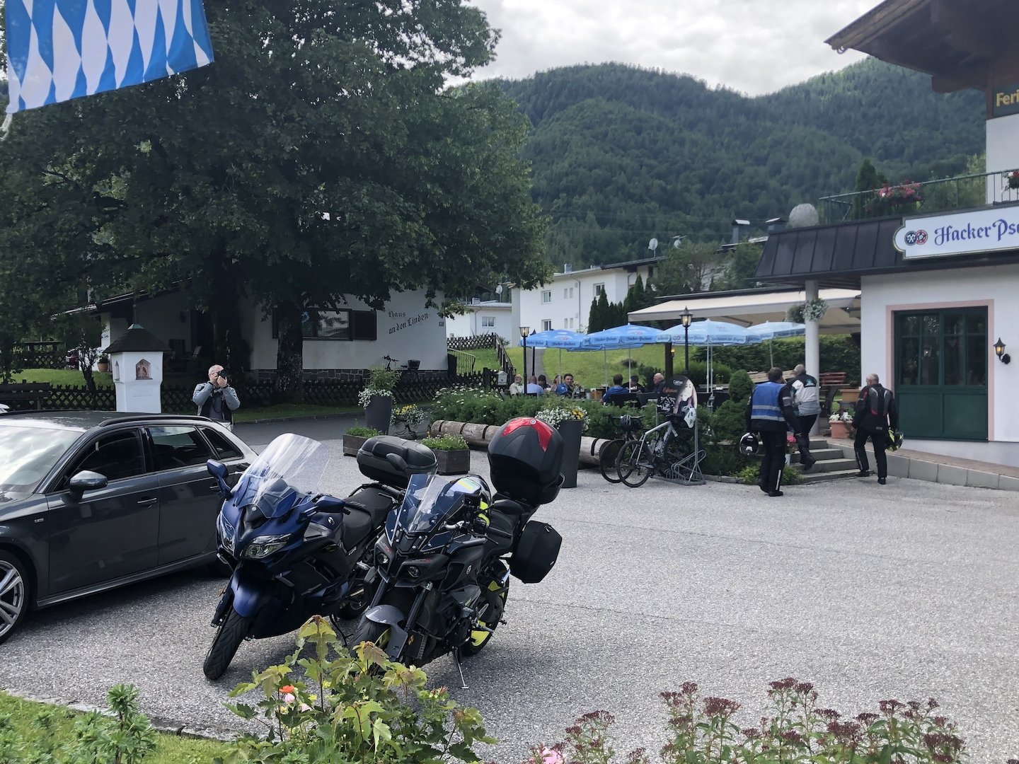 Anfahrt bei bestem Töffwetter nach Ried im Zillertal auf nicht 95 dB(A) limitierten Strassen via Sonthofen, Reutte, Garmisch (mit Polizeieskorte!), Isaartal (mit einer Gewitter- und Hageleinlage), Achensee nach Ried ins Hotel Platzerlhof.